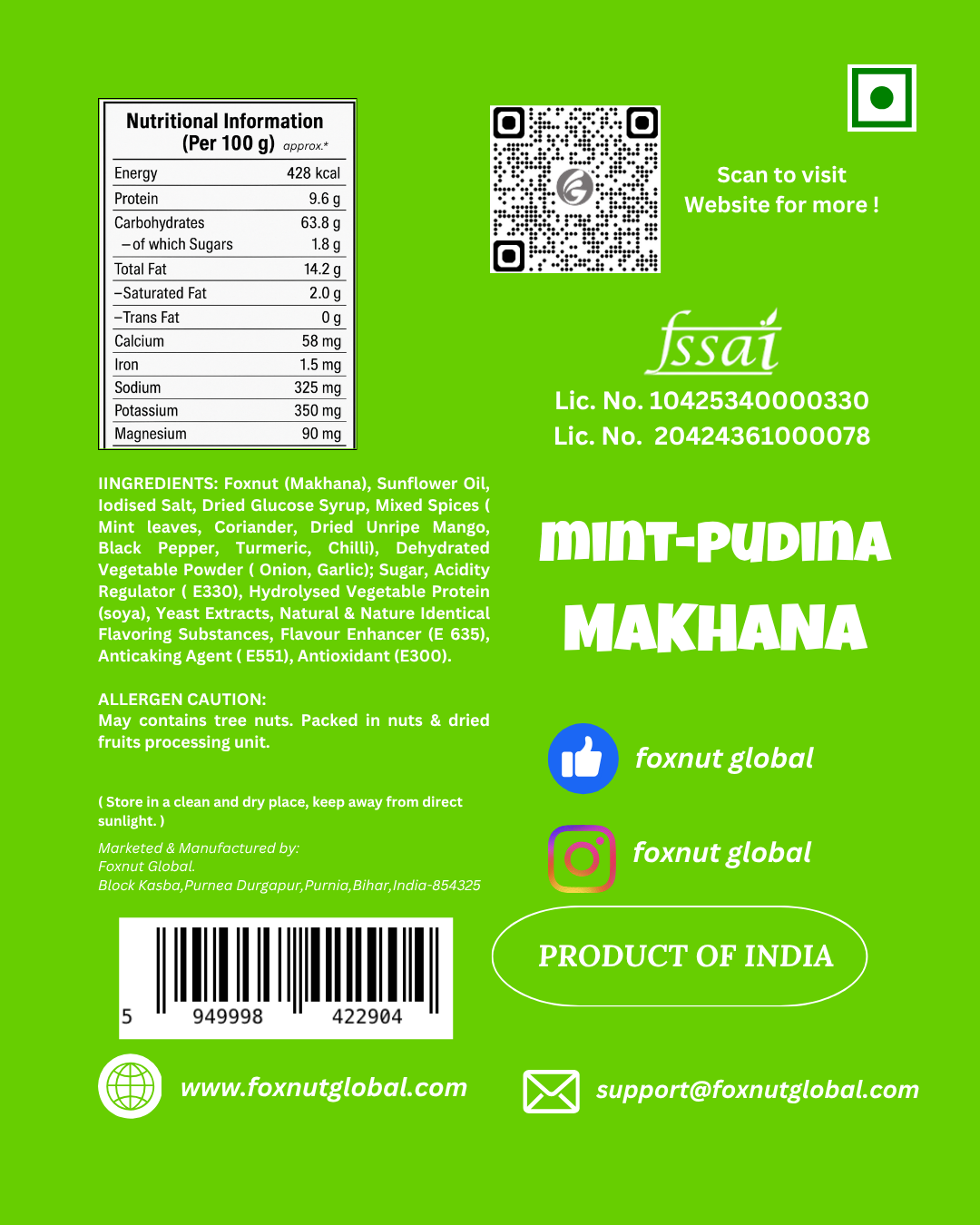 Crafted for those who love crisp, clean, herbal flavours, each foxnut is slow-roasted to airy perfection and dusted with a zingy blend of mint, pudina, and gentle spices.